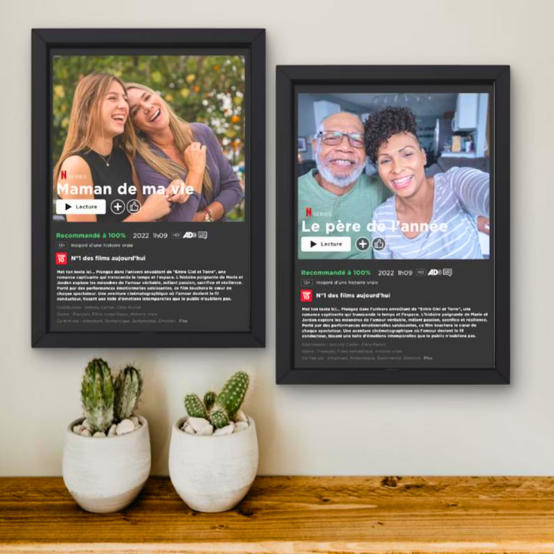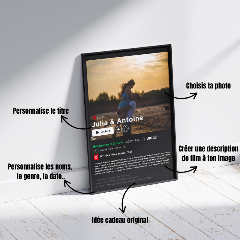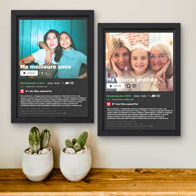 Certaines histoires mĂ©ritent dâĂȘtre racontĂ©es⊠en grand. Avec notre affiche personnalisĂ©e façon Netflix, vos moments forts prennent des allures de scĂšne mythique. Que ce soit un fou rire entre amis, un regard complice en amoureux ou une photo de famille pleine de tendresse, transformez vos souvenirs en une affiche digne des plus grands films.